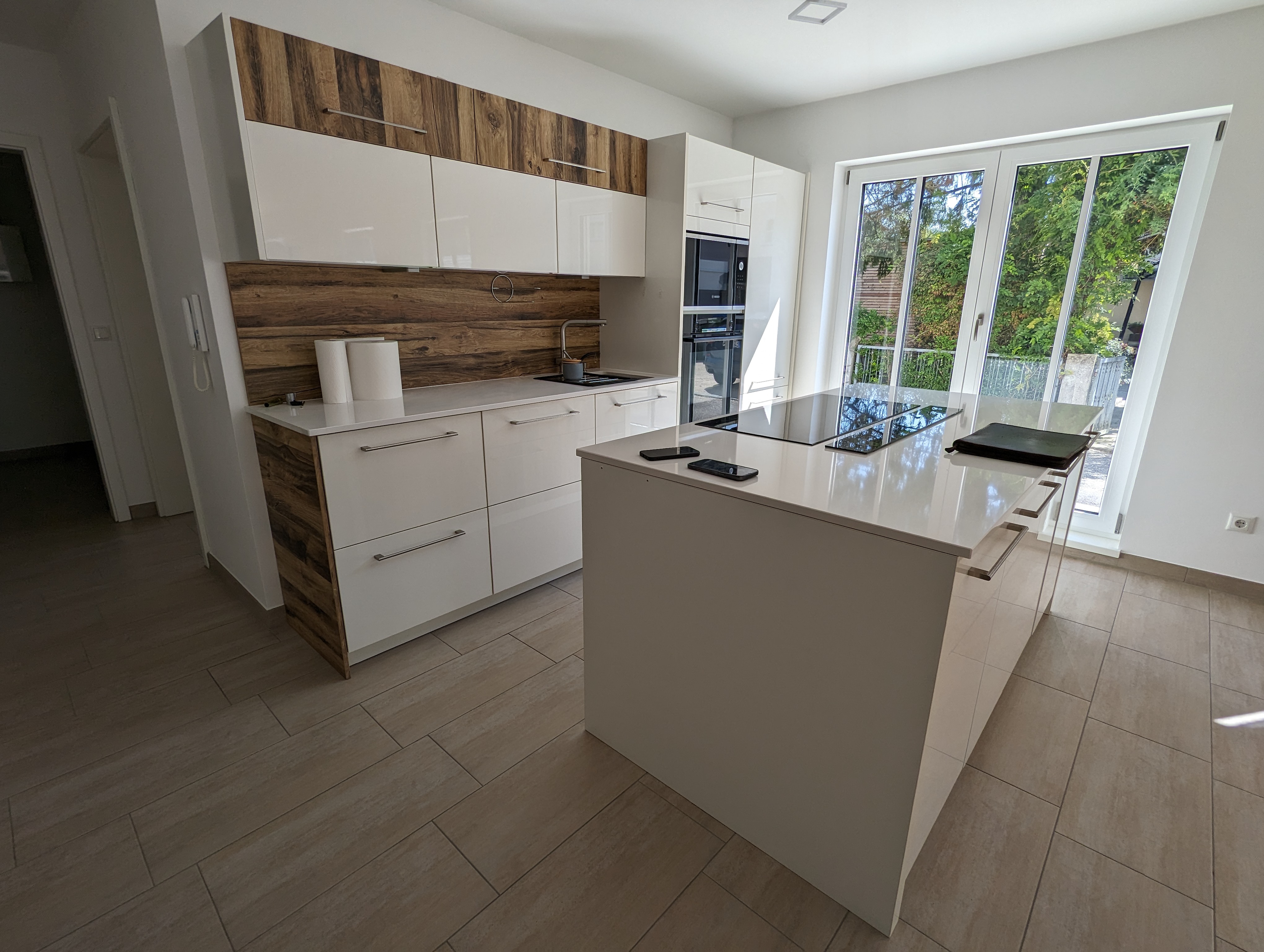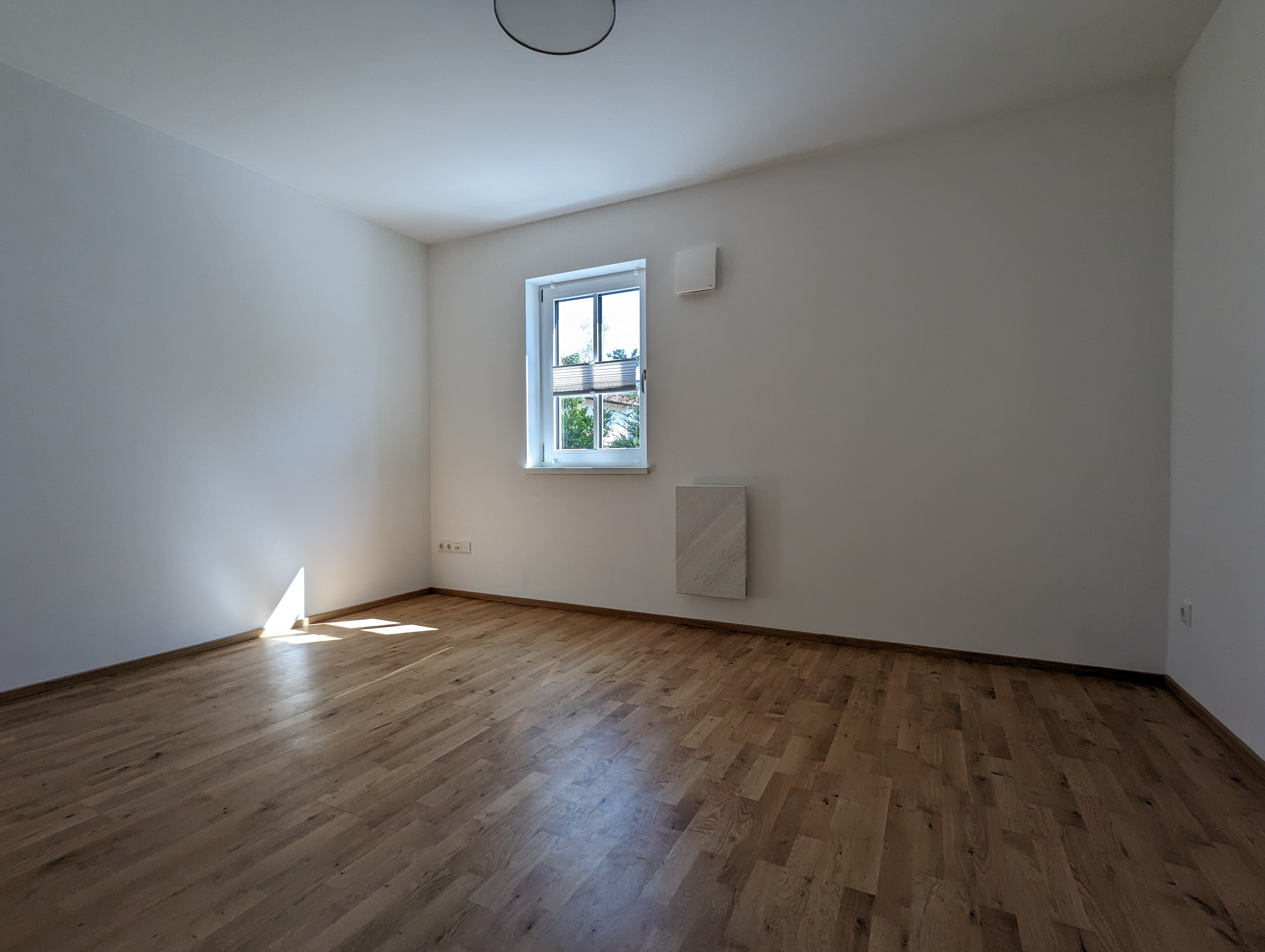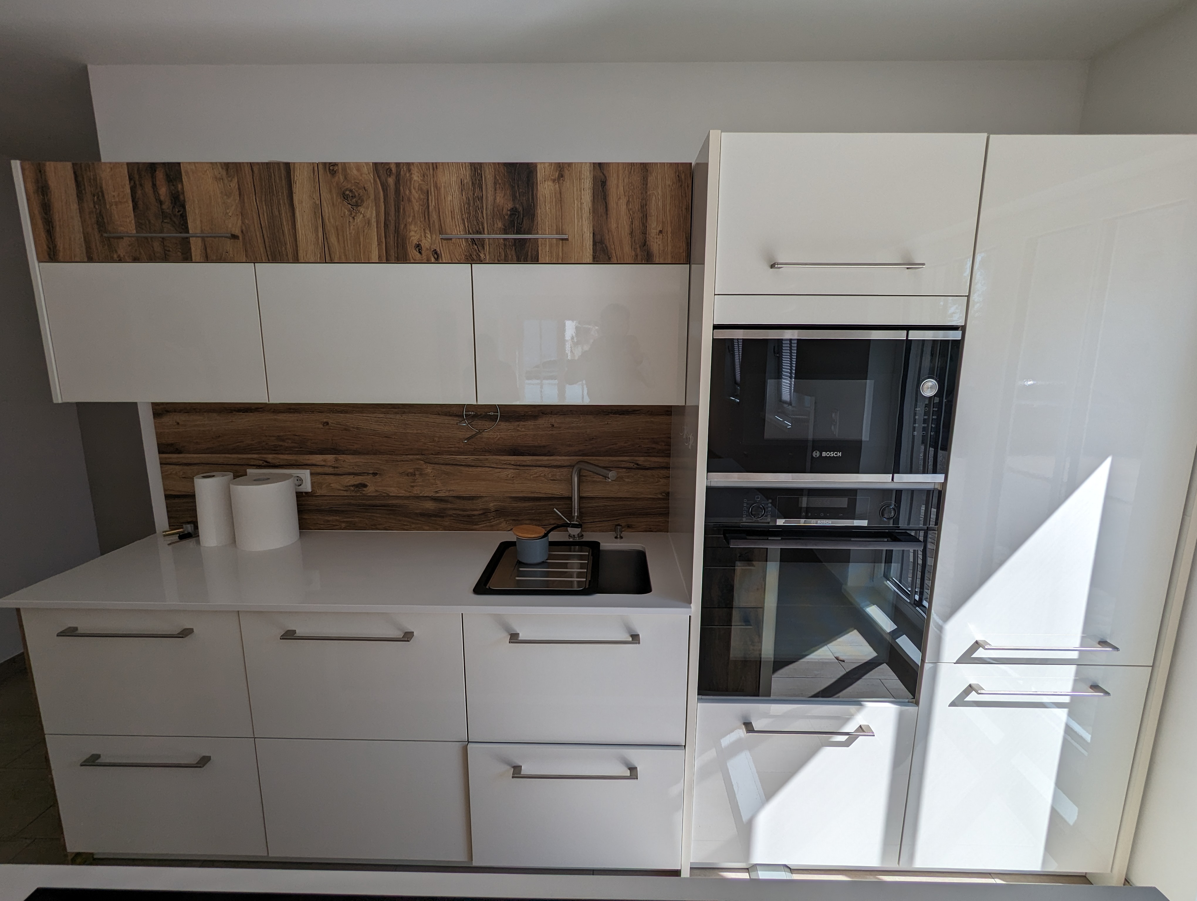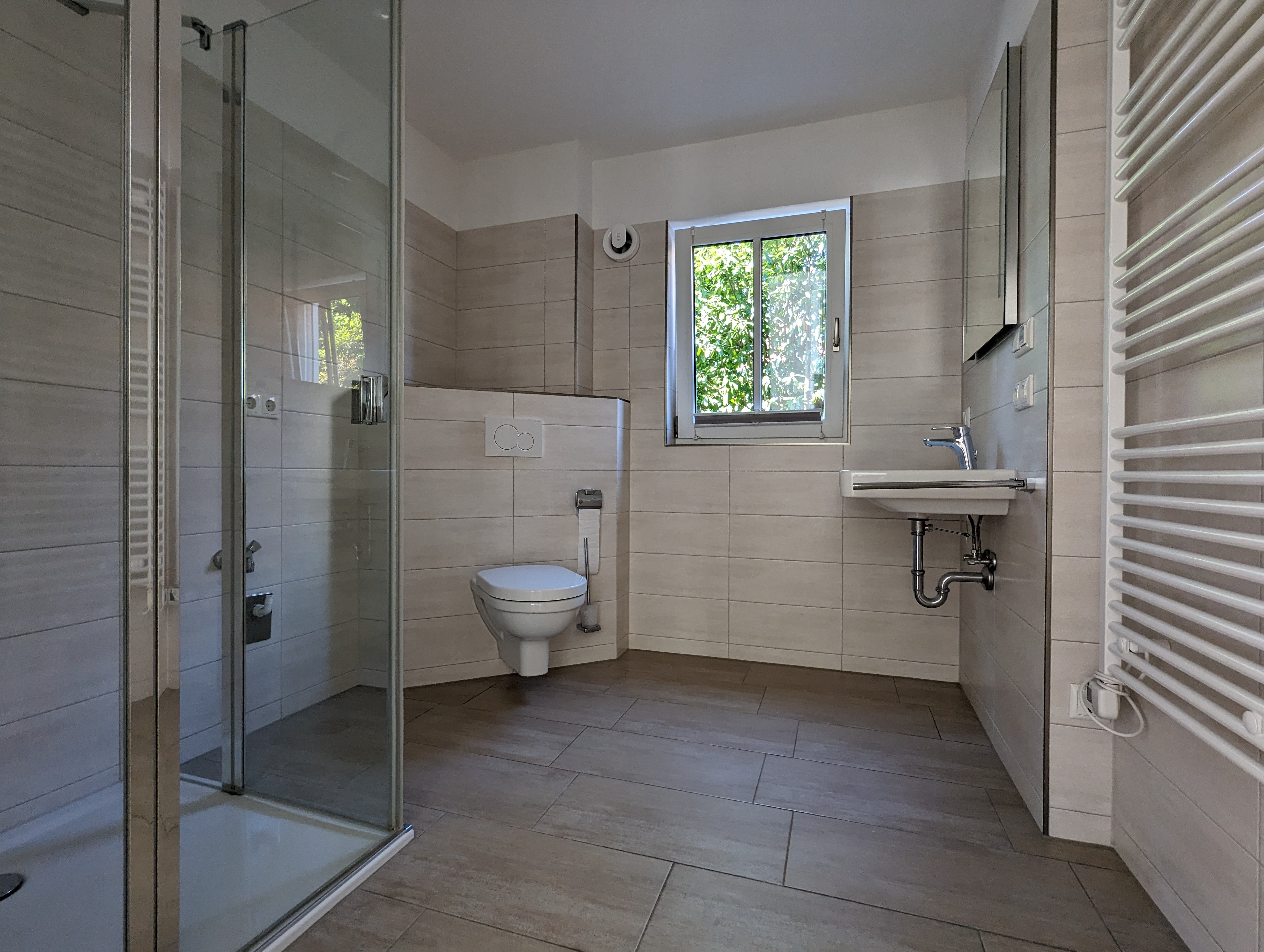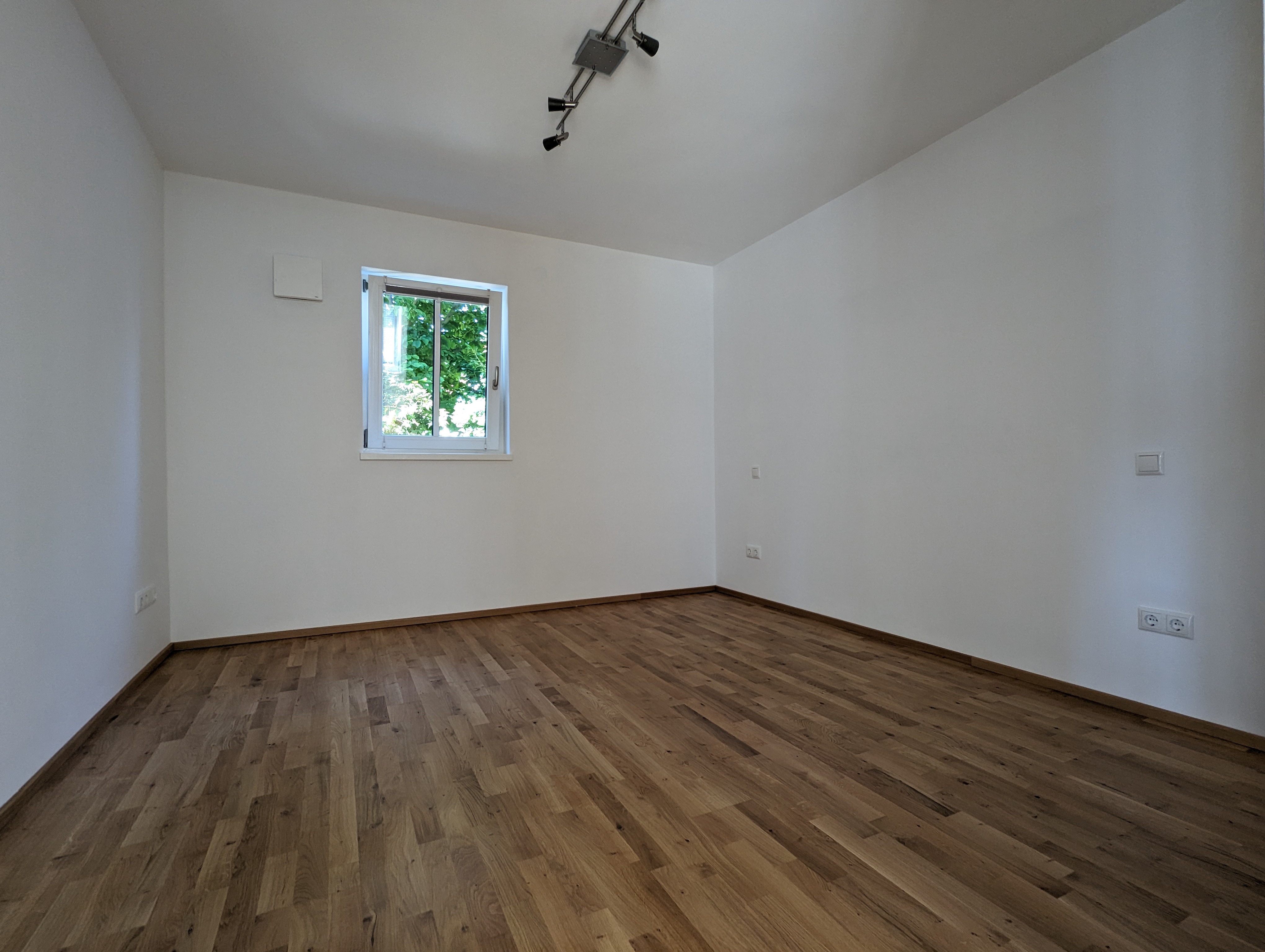 Es gibt hier zwei Schlafzimmer mit je fast 12 m² Wohnfläche, ein Büro oder Hauswirtschaftsraum mit ca. 9 m², das Duschbad mit großem Fenster hat über 6 m² und das große Wohn-/ Esszimmer mit integrierter Küche misst stattliche 42 m²; sehr vorteilhaft ist der ca. 3 m² große Abstellraum in der Wohnung. Die hochwertige Einbauküche gehört zur Wohnung und ist im Mietpreis bereits enthalten. Die Ausstattung erfüllt alle Wünsche, die ein anspruchsvoller Mieter an modernes Wohnen stellt: Der Eingang, das Bad, die Küche mit Essbereich sowie der Abstellraum wurden mit eleganten, großen Fliesen verlegt; alle anderen Räume sind mit hochwertigem Echtholzparkett versehen. Die sehr dichten Kunststofffenster sind 3-fach verglast und haben elektrisch betriebene Rollläden. Anstatt üblicher Heizkörper sind hier moderne und platzsparende Infrarotheizplatten verbaut. Im Bad finden Sie eine Fußbodenheizung sowie einen Handtuchheizkörper. Gesundes Wohnen garantiert die dezentrale Lüftungsanlage. Sehr platzsparend sind die Schiebetüren im Bad und im Wohnzimmer, das freundliche Bad ist dank des großen Fensters immer hell und freundlich, für viel Licht und Helligkeit im Wohn-/ Esszimmer sorgen die großen Fenstertüren.