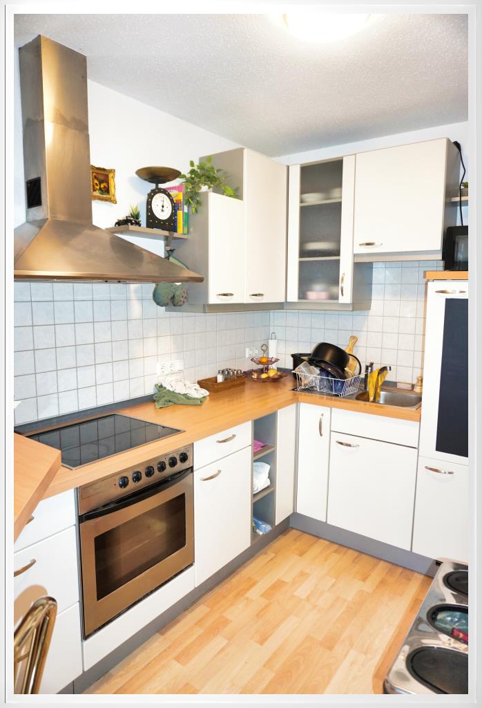 Die Küchenzeile ist im Wohnbereich integriert und mit einer Einbauküche ausgestattet.