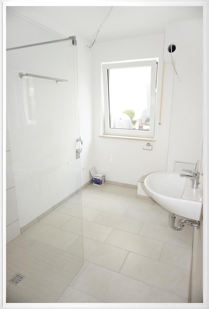 Das Badezimmer ist mit einer ebenerdigen Glasdusche ausgestattet und hell gefliest, hier gibt es auch einen Waschmaschinenanschluss sowie ein Fenster.