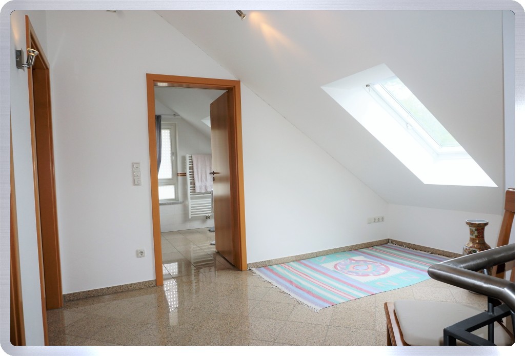 Im Dachgeschoss befinden sich zwei weitere Schlafzimmer. Hier befindet sich auch ein zweites elegantes Badezimmer mit Eckbadewanne, Dusche und Fußbodenheizung, sowie einem beheizbaren Handtuchhalter.