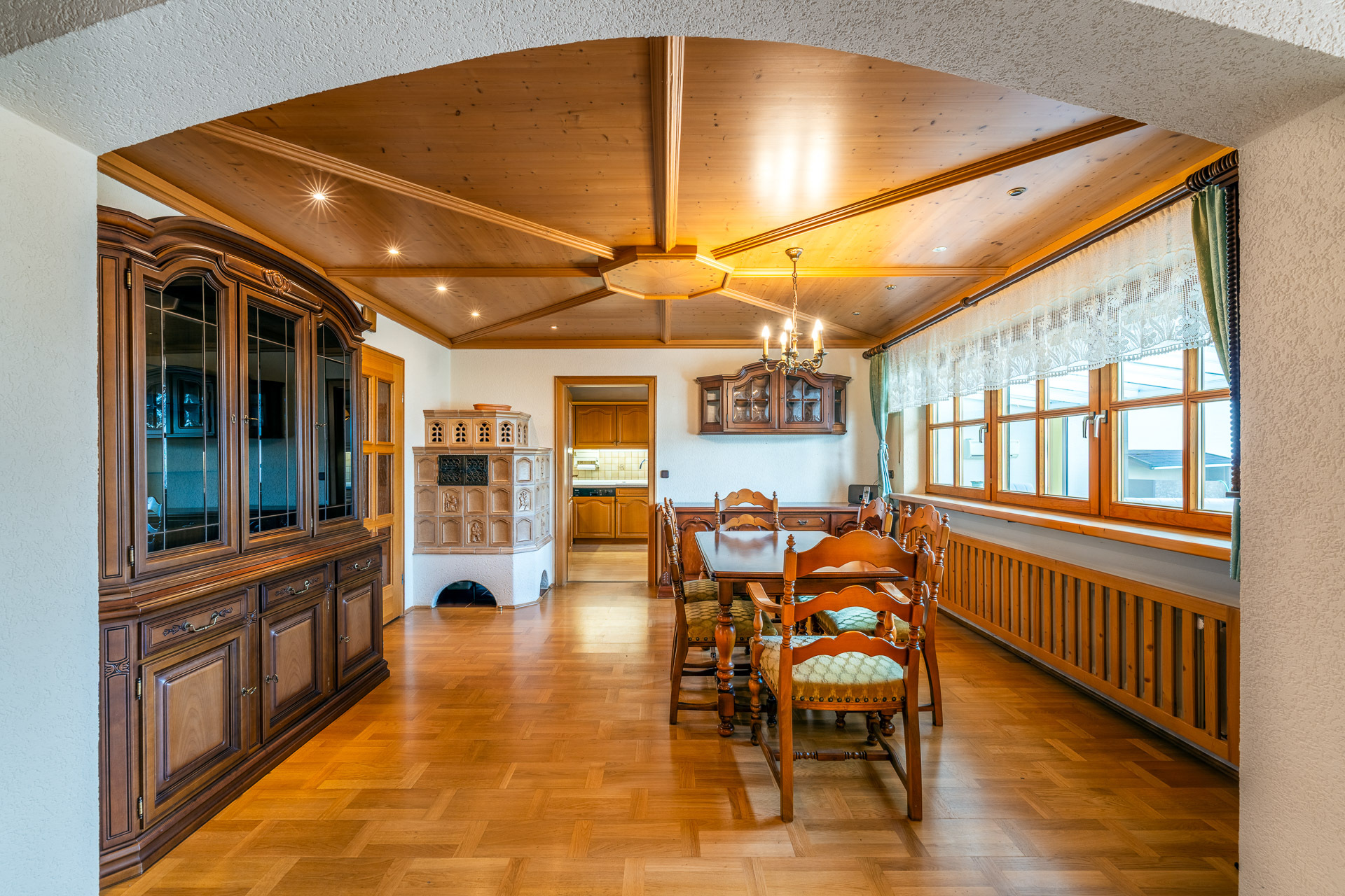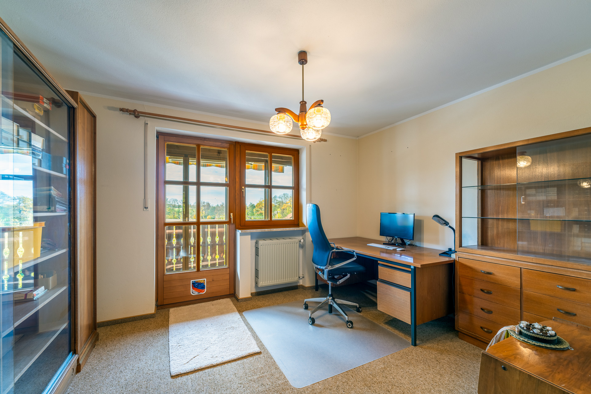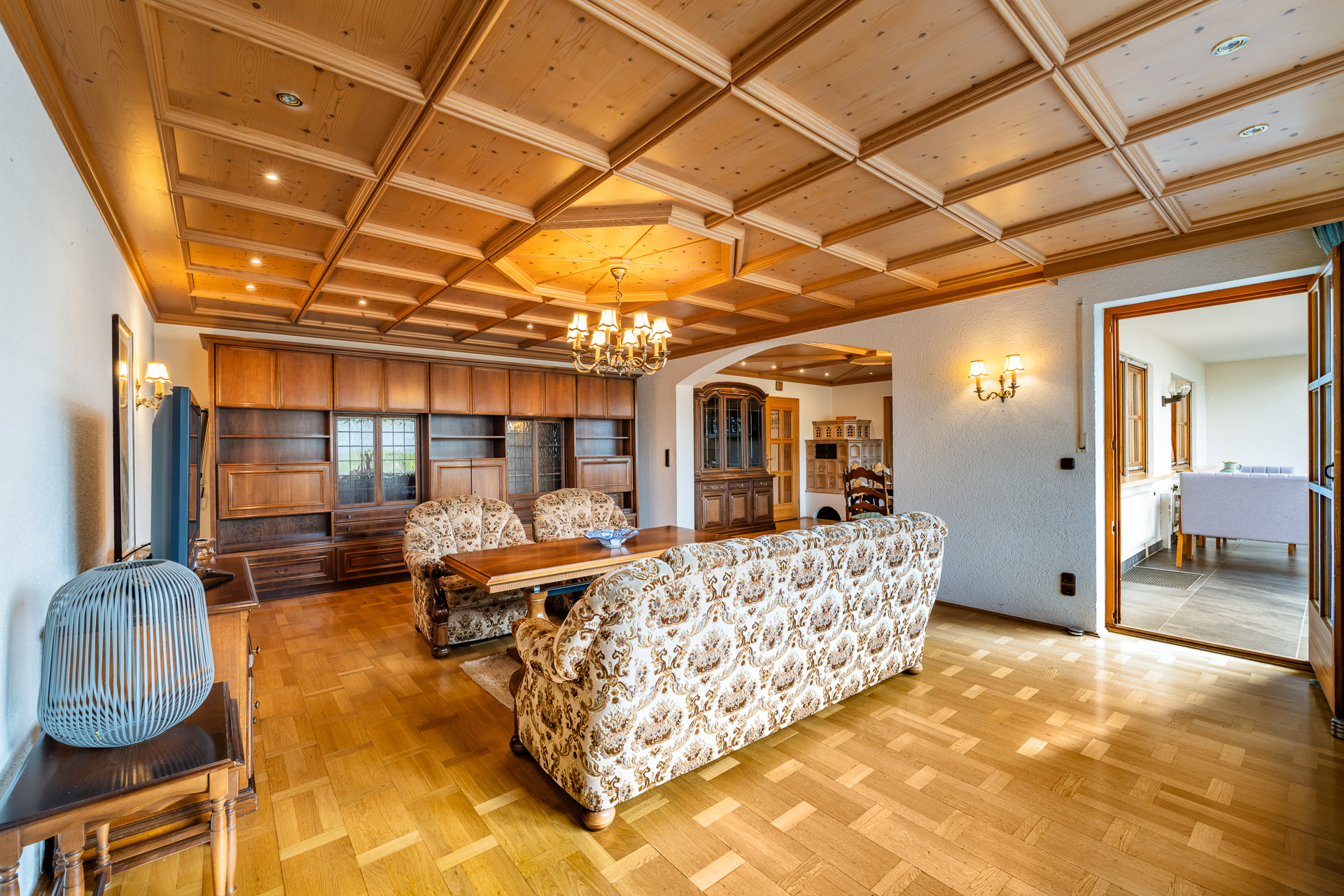 Die Fenster sind noch die ursprünglichen braunen Holzfenster, die Türen sind hochwertige Vollholztüren, die Decken im Erdgeschoss geschmackvoll vertäfelt. Die grosse Einbauküche mit allen Großgeräten ist im Preis inbegriffen, ebenso die Doppelgarage mit Elektroantrieb. Besondere Highlights des Hauses sind der ca. 20 m² große - beheizbare Wintergarten, der das ganze Jahr über bewohnt werden kann und der Südgarten davor, der unverbaut an die Felder angrenzt - der ideale Platz für die ganze Familie zum Spielen, Feiern und Entspannen! Selbstverständlich ist das ganze Haus unterkellert, deshalb ist auch dort genügend Platz für einen Hobbyraum, die Ölheizung und die Vorräte. Hier finden Sie ein ungewöhnlich großes Ein-/ bis -Zweifamilienhaus, das genügend Platz für zwei Generationen bietet und das sich sehr gut eignet für Familie und Home-Office. Das Haus ist bereits bezugsfrei - Sie können nach Absprache einziehen!