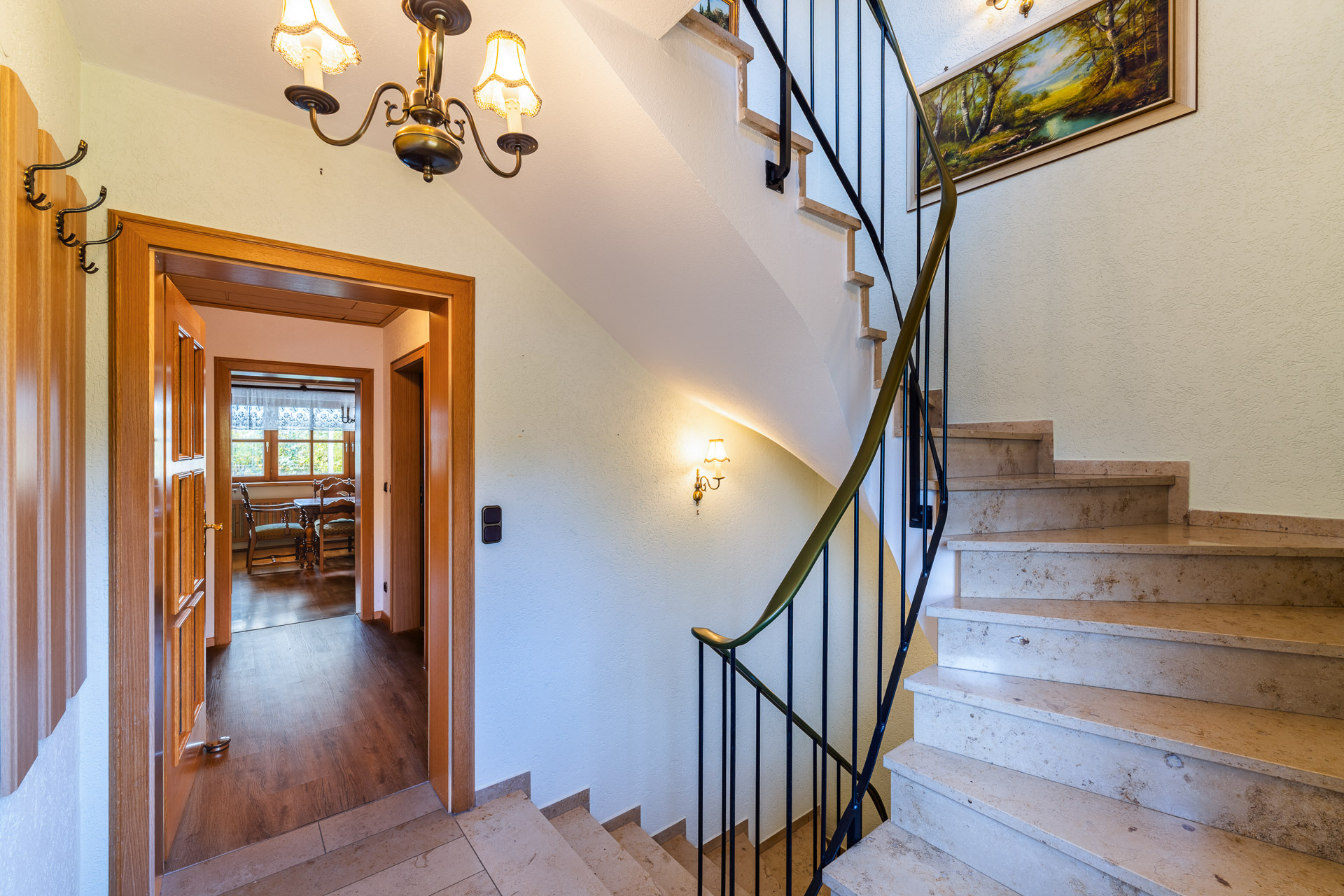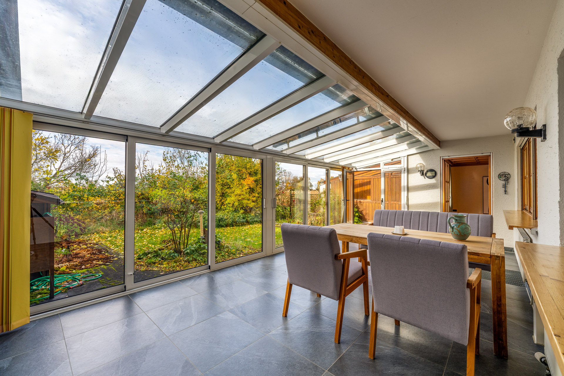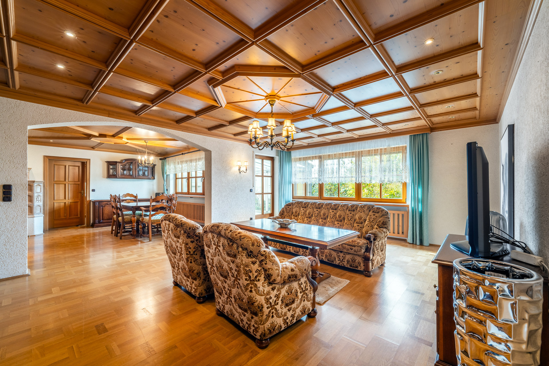 Die Fenster sind noch die ursprünglichen braunen Holzfenster, die Türen sind hochwertige Vollholztüren, die Decken im Erdgeschoss geschmackvoll vertäfelt. Die grosse Einbauküche mit allen Großgeräten ist im Preis inbegriffen, ebenso die Doppelgarage mit Elektroantrieb. Besondere Highlights des Hauses sind der ca. 20 m² große - beheizbare Wintergarten, der das ganze Jahr über bewohnt werden kann und der Südgarten davor, der unverbaut an die Felder angrenzt - der ideale Platz für die ganze Familie zum Spielen, Feiern und Entspannen! Selbstverständlich ist das ganze Haus unterkellert, deshalb ist auch dort genügend Platz für einen Hobbyraum, die Ölheizung und die Vorräte. Hier finden Sie ein ungewöhnlich großes Ein-/ bis -Zweifamilienhaus, das genügend Platz für zwei Generationen bietet und das sich sehr gut eignet für Familie und Home-Office. Das Haus ist bereits bezugsfrei - Sie können nach Absprache einziehen!