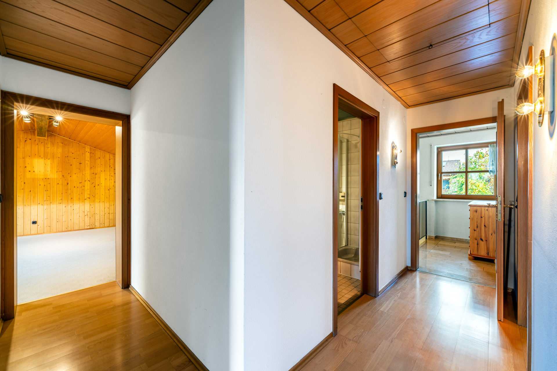 Beschreibung:Dieses riesige Ein-/ bis Zweifamilienhaus wurde im Jahr 1986 in gesunder Ziegelbauweise erstellt und seitdem von den Eigentümern selbst bewohnt; es liegt in einer sehr ruhigen, beliebten Wohnlage von Walpertskirchen im Landkreis Erding. Hier erwerben Sie ein stattliches Haus mit ca. 180 m² Wohnfläche und ca. 353 m² Grund. Das Erdgeschoss mit ca. 110 m² Wohnfläche hat eine fast 13 m² große Wohnküche, ein über 16 m² großes Esszimmer sowie das fast 28 m² große Wohnzimmer, das behindertengerechte Bad mit ebenerdiger Dusche sowie den beheizbaren, ganzjährig bewohnbaren Wintergarten. Ein Schlafzimmer rundet diese Etage ab. Im Obergeschoss mit ca. 70 m² Wohnfläche finden Sie die drei komfortable Schlafzimmer, den riesigen ausgebauten Raum über der Garage, das helle Bad mit Wanne und Dusche sowie den überdachten Balkon mit weitem Blick über die Felder ins Grüne. Die Ausstattung des ganzen Hauses ist sehr gediegen und hochwertig: Der Eingangsbereich und die Treppe zum Obergeschoss sind mit Marmorfliesen ausgestattet, die Bäder mit hellen Fliesen, das Wohnzimmer mit Echholzparkett, in den übrigen Räumen liegen Laminat - bzw. Teppichböden.
