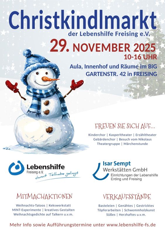 Der Christkindlmarkt der Lebenshilfe Freising verbindet weihnachtliche Atmosphäre mit sozialem Engagement. Die Erlöse aus den Verkäufen kommen den vielfältigen Angeboten der Lebenshilfe zugute – von inklusiver Kinderbetreuung über Assistenzleistungen im Alltag bis hin zu Freizeit- und Bildungsangeboten für Menschen mit Behinderung.