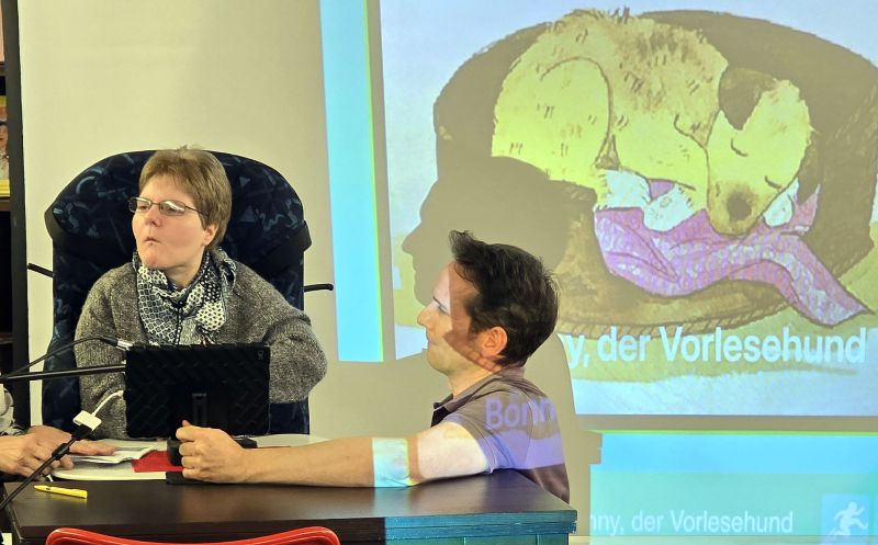 Die Teilnehmer*innen der Förderstätte Wilfried Schraufstetter, Doris Ehlert und Theresa Schwarzbözl begeisterten das Publikum mit eigenen Texten, Geschichten und Gedichten. Unterstützt wurden sie dabei von Sprachausgabegeräten und einer Kommunikations-App auf dem iPad (GoTalk), die es auch Menschen mit eingeschränkter Lautsprache ermöglichen, aktiv am Austausch teilzunehmen.