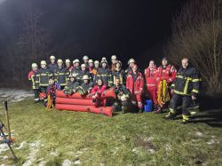 Eineinhalb Stunden übten die 20 anwesenden Feuerwehrkameraden / -innen an zwei Stationen mit den Steckleitern und dem Eisrettungsgerät gemeinsam mit den Wasserrettern, wobei sich hier drei Retter als Verunglückte zur Verfügung stellten. Zur Sicherheit der Teilnehmer, aber auch der Mimen wurden diese natürlich mit Leinen gesichert.