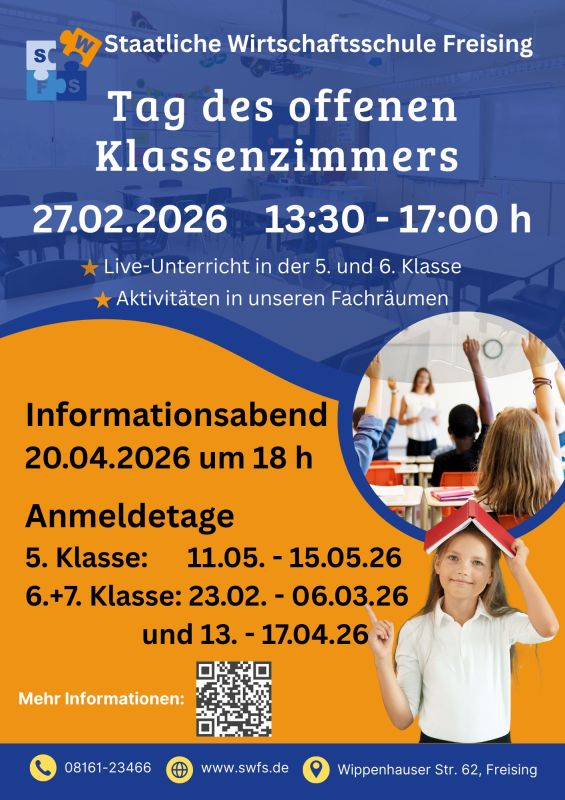 Die Staatliche Wirtschaftsschule Freising öffnet ihre Türen und lädt interessierte Schülerinnen und Schüler sowie deren Eltern herzlich zum „Tag des offenen Klassenzimmers“ ein.