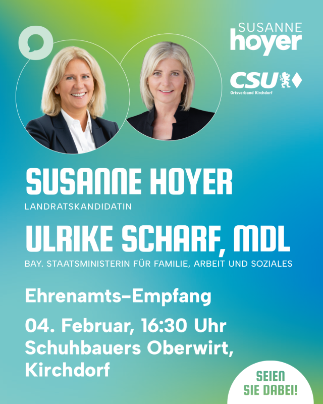 Aus diesem Grund laden CSU-Landratskandidatin Susanne Hoyer und der CSU-Kreisverband Freising herzlich zum Ehrenamtsempfang mit Ulrike Scharf, MdL, der Bayerische Staatsministerin für Familie, Arbeit und Soziales am Mittwoch, 4. Februar 2026 in den Gasthof Oberwirt, Sternstr. 20, 85414 Kirchdorf ein. Beginn ist um 16:30 Uhr.
