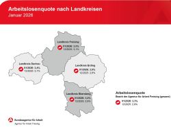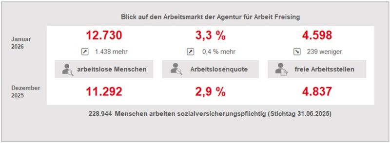 Arbeitslosigkeit: Bei der Agentur für Arbeit Freising waren im Januar 2026 insgesamt 4.129 Personen arbeitslos gemeldet, 464 Frauen und Männer mehr als noch im Dezember 2025. Diese Entwicklung hatte auch Auswirkungen auf die Arbeitslosenquote: Diese stieg um 0,4 Prozent-punkte auf einen aktuellen Wert von 3,5 Prozent an. Im Januar des Vorjahres lag die Arbeitslosenquote im Landkreis ebenfalls bei 3,5 Prozent.