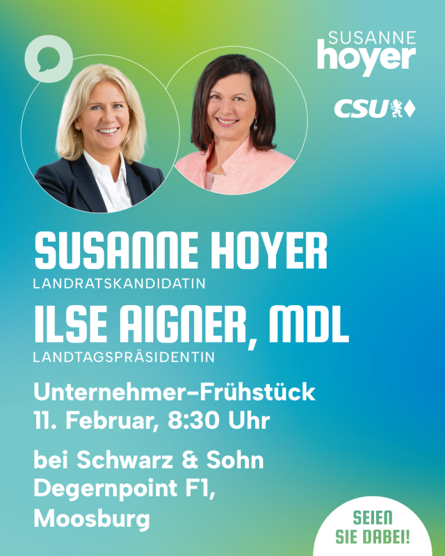 Über diese zentralen Zukunftsfragen möchte CSU-Landratskandidatin Susanne Hoyer, zusammen mit dem CSU-Kreisverband Freising, mit den Unternehmerinnen und Unternehmern der Region ins Gespräch kommen. Gemeinsam mit der Fa. Schwarz & Sohn laden sie alle Unternehmerinnen und Unternehmer herzlich zu einem Unternehmer-Frühstück mit der Präsidentin des Bayerischen Landtags, Ilse Aigner, MdL, ein.