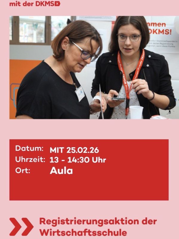 Am Mittwoch, 25. Februar organisieren die Schulgemeinschaft der Staatlichen Wirtschaftsschule in der Zeit von 13:00 bis 14:30 Uhr eine lebenswichtige Registrierungsaktion in Kooperation mit der DKMS.